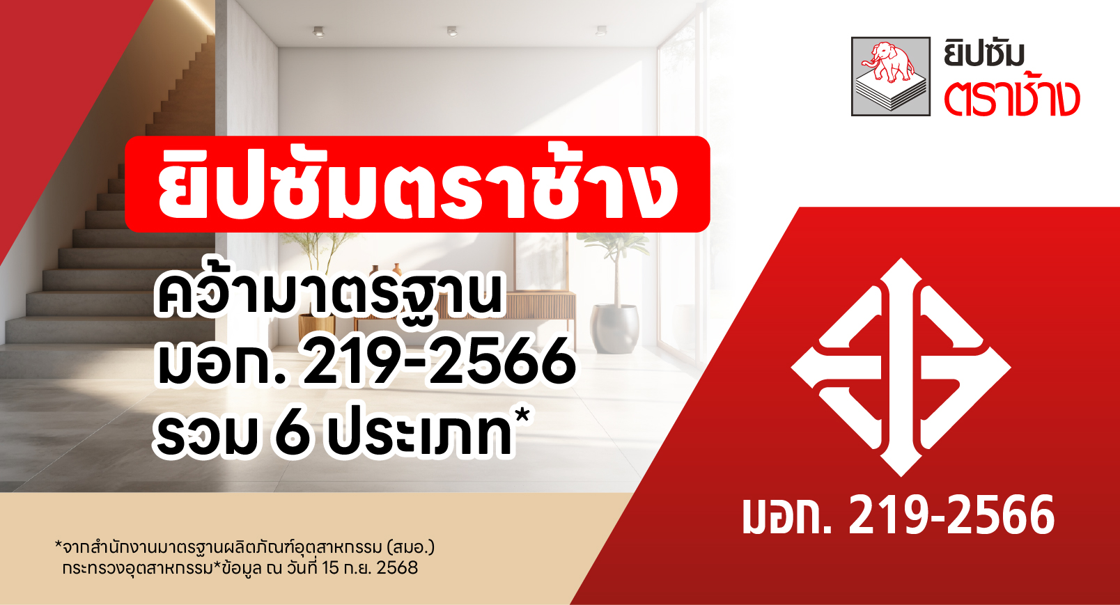 มาตรฐาน มอก. 219–2566 ถือเป็นมาตรฐานฉบับใหม่จัดทำโดยสำนักงานมาตรฐานผลิตภัณฑ์อุตสาหกรรม (สมอ.) เพื่อเป็นแนวทางสำหรับผู้ใช้งานในการเลือกใช้วัสดุก่อสร้างที่ได้ตามมาตรฐานที่กำหนดไว้ เพื่อสร้างความปลอดภัยให้แก่ผู้ใช้งานไม่เพียงแต่เจ้าของบ้าน แต่รวมถึงสถาปนิก เจ้าของโครงการ ไปจนถึงช่างมืออาชีพ โดยกำหนดเกณฑ์คุณสมบัติที่ผ่านการทดสอบในเรื่องของคุณสมบัติของแผ่นยิปซัม เช่น การสะท้อนรังสีความร้อน การดูดซึมน้ำ ไปจนถึงความแข็งของผิวหน้า เพื่อรองรับทนการกระแทก ให้มั่นใจว่าแผ่นยิปซัมของยิปซัมตราช้างคือแผ่นที่ได้มาตรฐานเป็นที่ยอมรับในระดับประเทศ