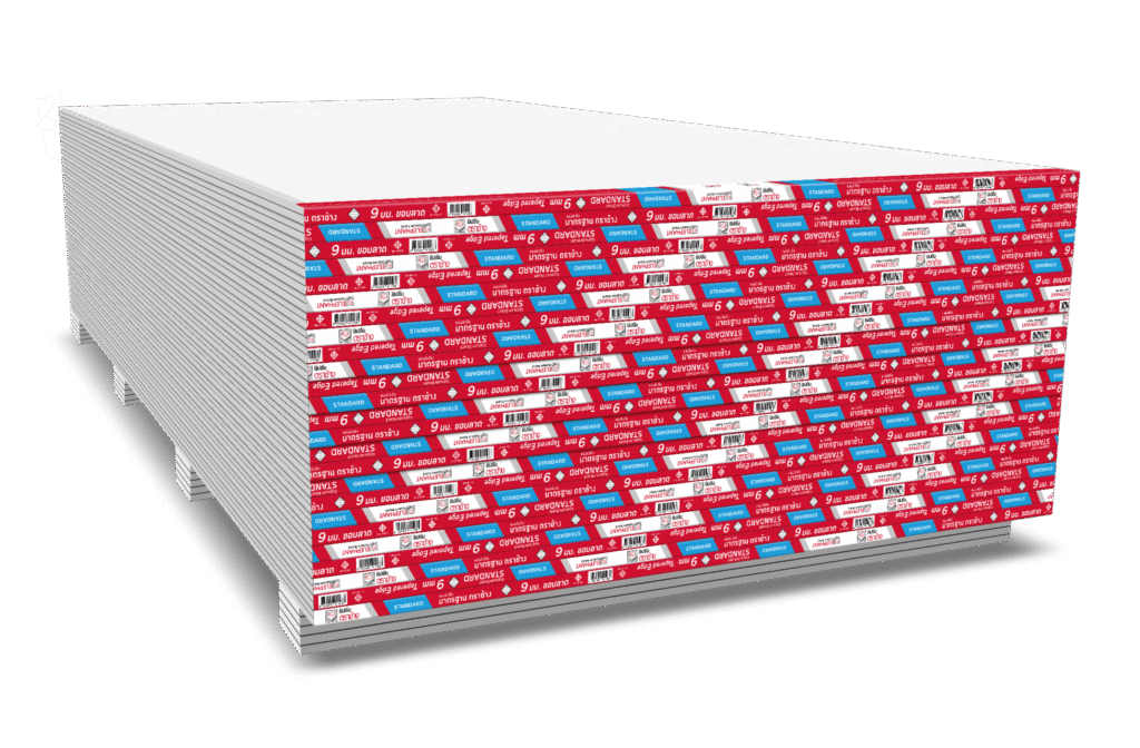 แผ่นยิปซัมมาตรฐานหรือแผ่นยิปซัมแบบทั่วไป เป็นแผ่นยิปซัมที่มีลักษณะเป็นแผ่นผิวเรียบภายนอกจะมีความเรียบเนียนคล้ายกับแผ่นปูนซีเมนต์ ทนความร้อนไม่ลามไฟ มีความหนาให้เลือกตั้งแต่ 9-15 มม. นิยมใช้เป็นวัสดุสำหรับตกแต่งภายใน โดยเฉพาะในห้องนั่งเล่นและห้องนอน รวมถึงใช้ทำฝ้าเพดานทีบาร์ได้อีกด้วย