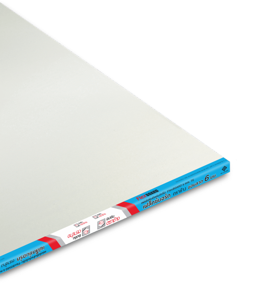 แผ่นยิปซัมเฟล็กซ์บอร์ด ตราช้าง (ดัดโค้ง) มีส่วนผสมของเส้นใยพิเศษเพื่อช่วยเสริมการยึดเกาะ และประกบด้วยกระดาษอัดแน่นพิเศษ ที่มีความแข็งแรงสูง เหมาะสำหรับการดัดโค้งเป็นพิเศษ